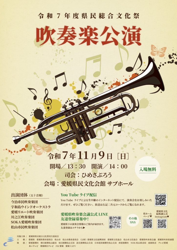 令和7年度県民総合文化祭のお知らせ Posted on 2025年10月20日2025年10月20日 by matsuyamashisui 令和7年11月9日(日)、県民文化会館サブホールにおいて、令和7年度県民総合文化祭が開催されます。県内の、吹奏楽を愛する6団体が出演し、普段なかなかできない大迫力の合同演奏などの企画もあります。13時30分開場、14時開演です。ぜひお越しください。